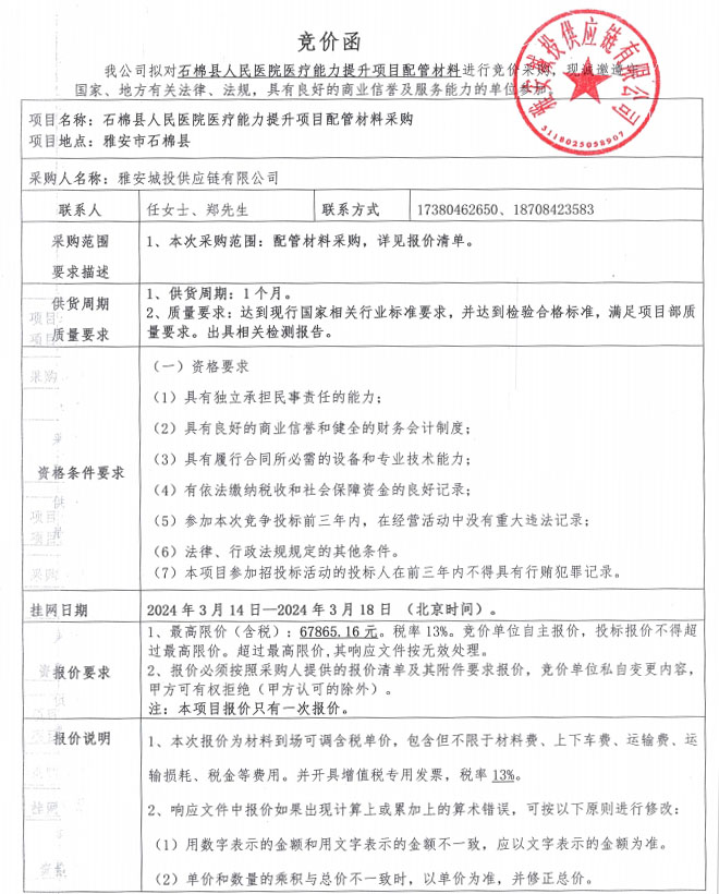 石棉縣人民醫(yī)院醫(yī)療能力提升項(xiàng)目配管材料競價(jià)公告
