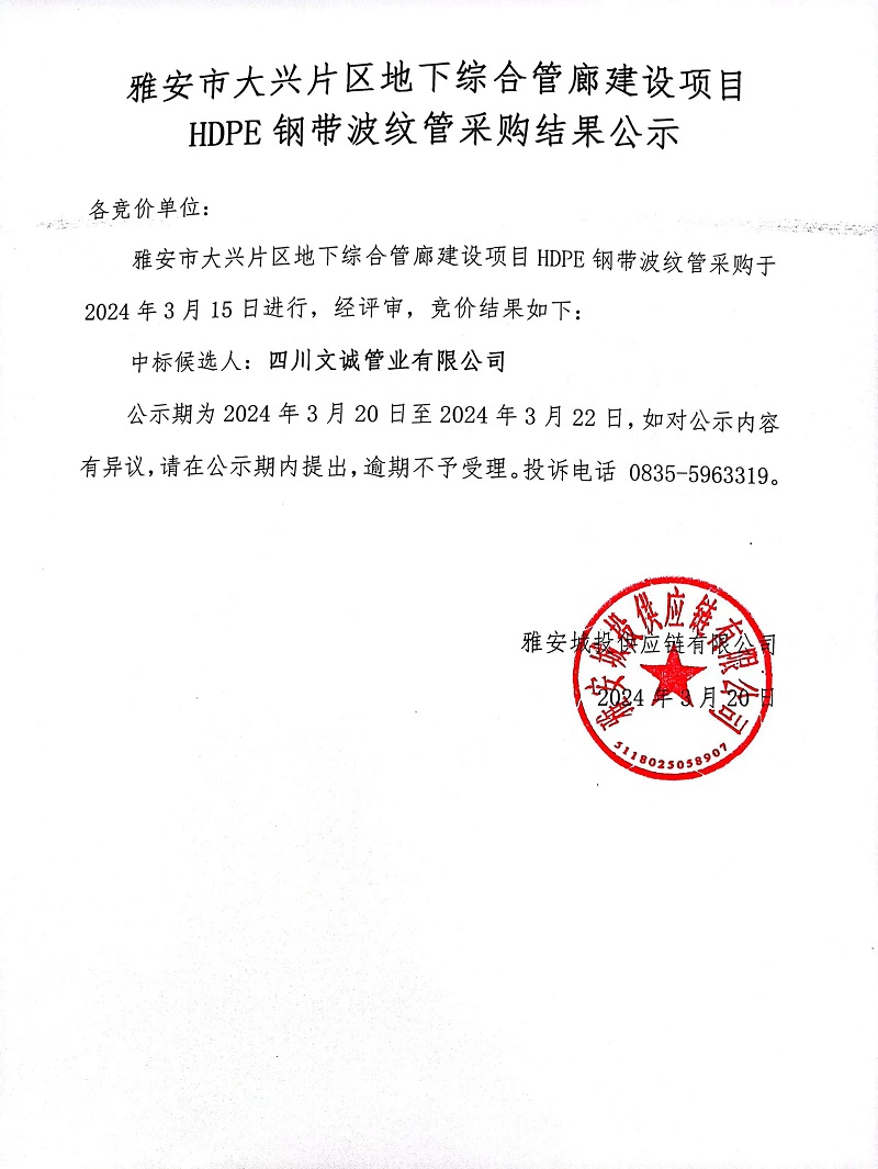 雅安市大興片區(qū)地下綜合管廊建設(shè)項(xiàng)目HDPE鋼帶波紋管采購(gòu)結(jié)果公示