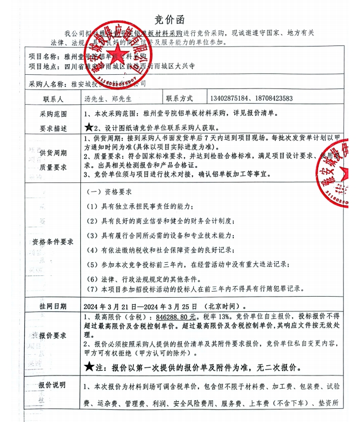 雅州壹號院鋁單板材料采購競價公告