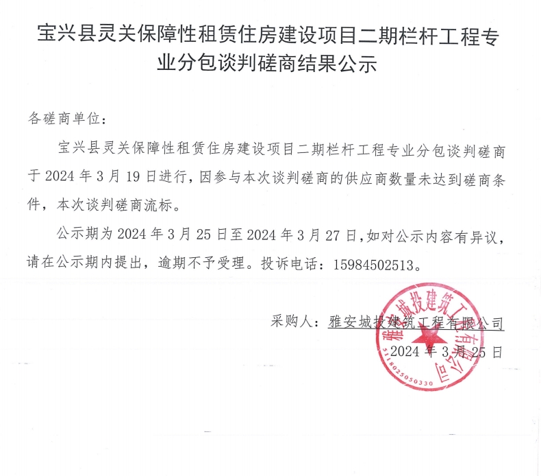 寶興縣靈關(guān)保障性租賃住房建設(shè)項(xiàng)目二期欄桿工程專業(yè)分包談判磋商結(jié)果公示