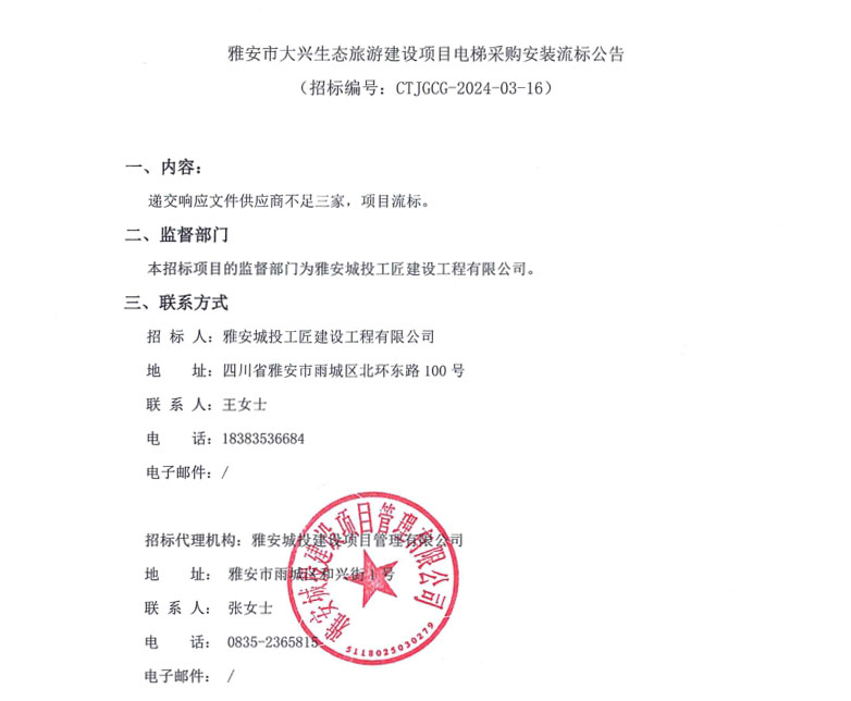 雅安市大興生態(tài)旅游建設(shè)項(xiàng)目電梯采購(gòu)安裝流標(biāo)公告