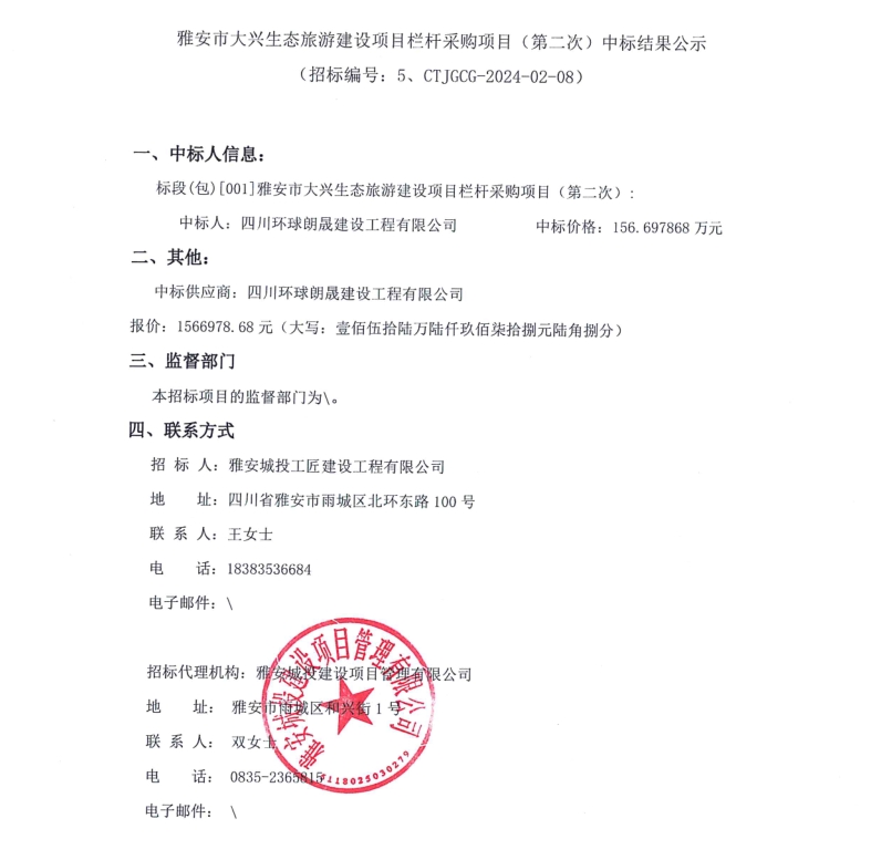 雅安市大興生態(tài)旅游建設(shè)項(xiàng)目欄桿采購(gòu)項(xiàng)目(第二次)中標(biāo)結(jié)果公示