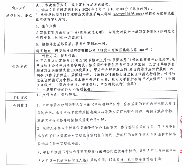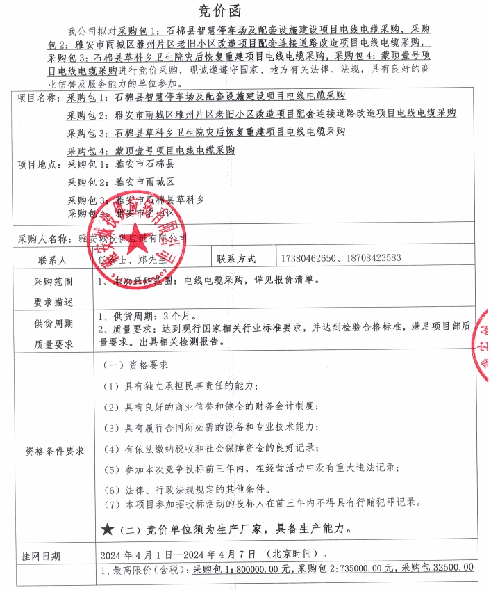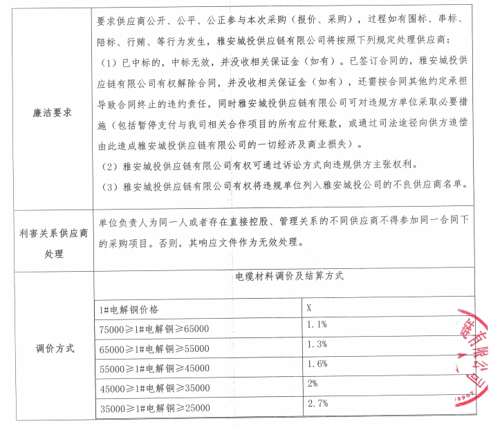 雅安城投供應(yīng)鏈有限公司電線電纜采購競價(jià)公告