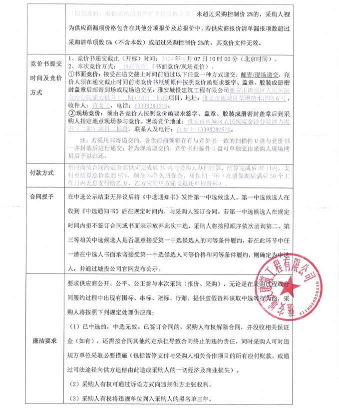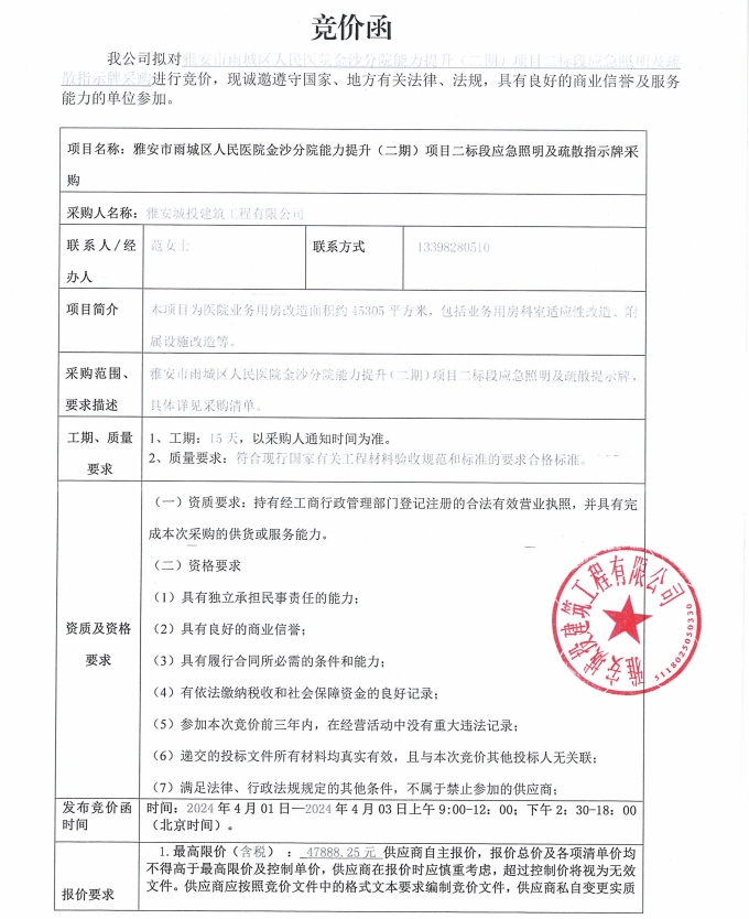 雅安市雨城區(qū)人民醫(yī)院金沙分院能力提升(二期)項目二標段應(yīng)急照明及疏散指示牌采購競價公告