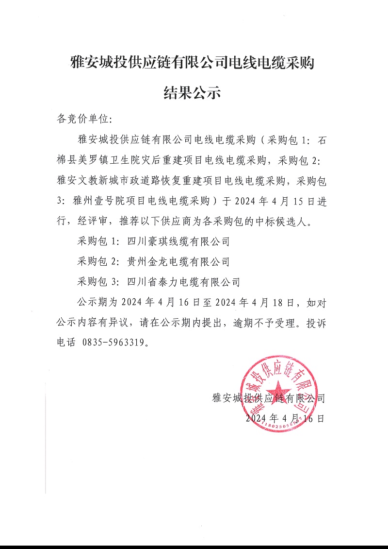 雅安城投供應鏈有限公司電線電纜采購結果公示