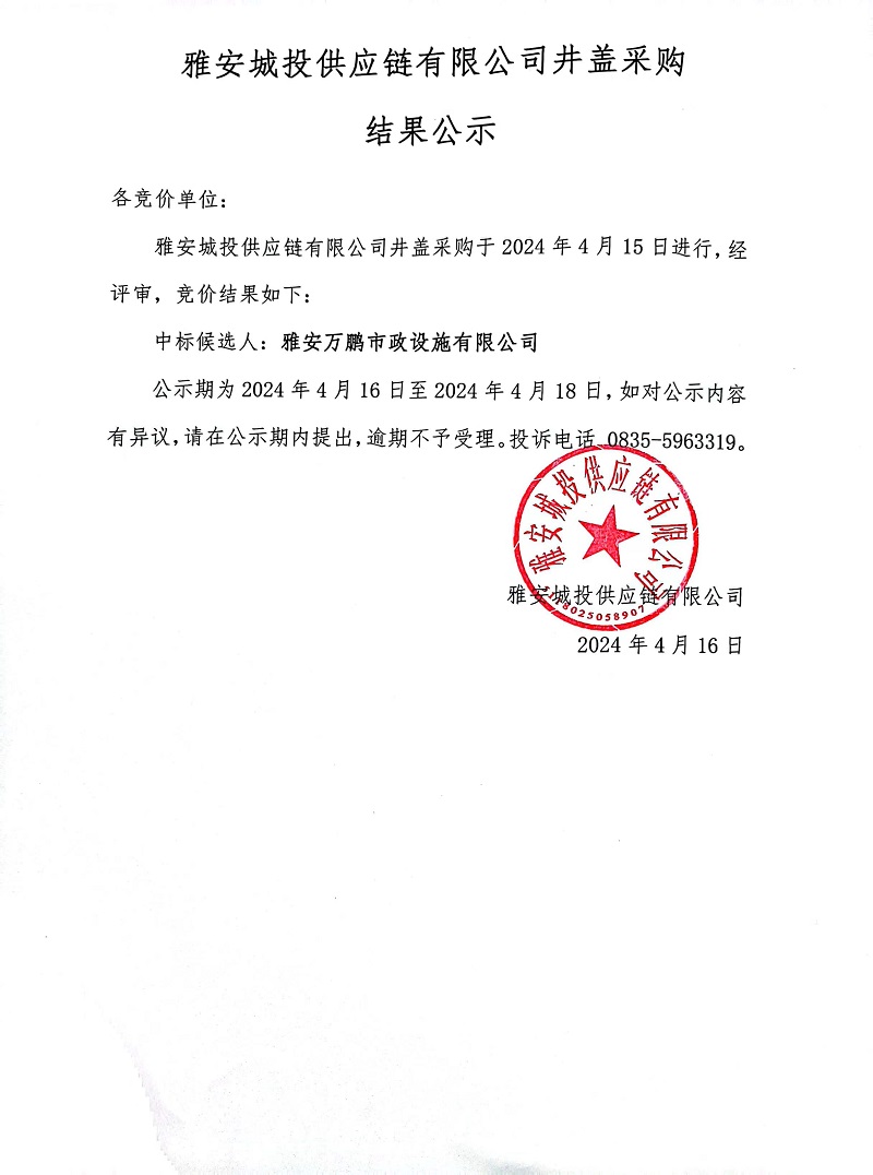 雅安城投供應鏈有限公司井蓋采購結果公示
