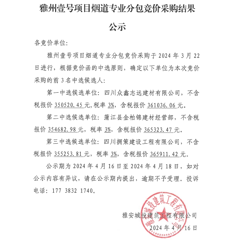 雅州壹號(hào)項(xiàng)目煙道專業(yè)分包競(jìng)價(jià)采購(gòu)結(jié)果公示