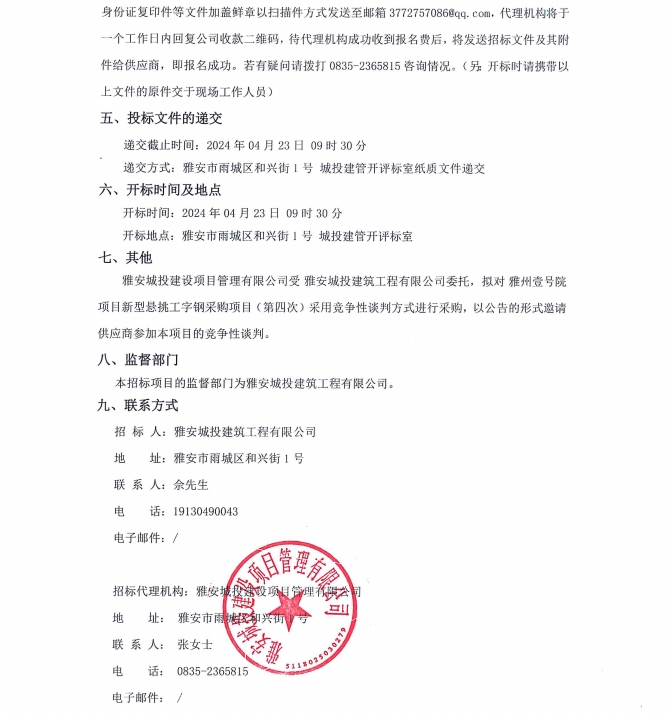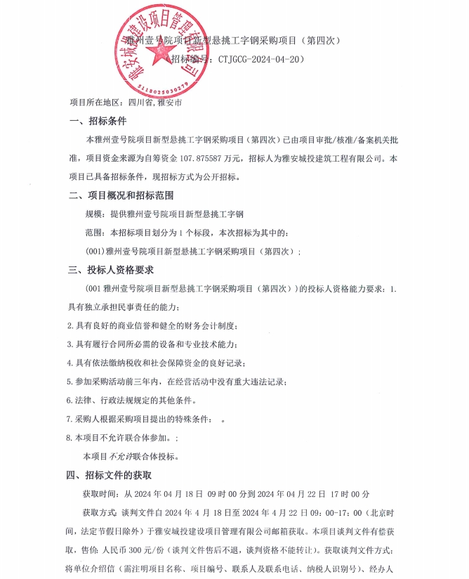 雅州壹號院項(xiàng)目新型懸挑工字鋼采購項(xiàng)目(第四次)公告