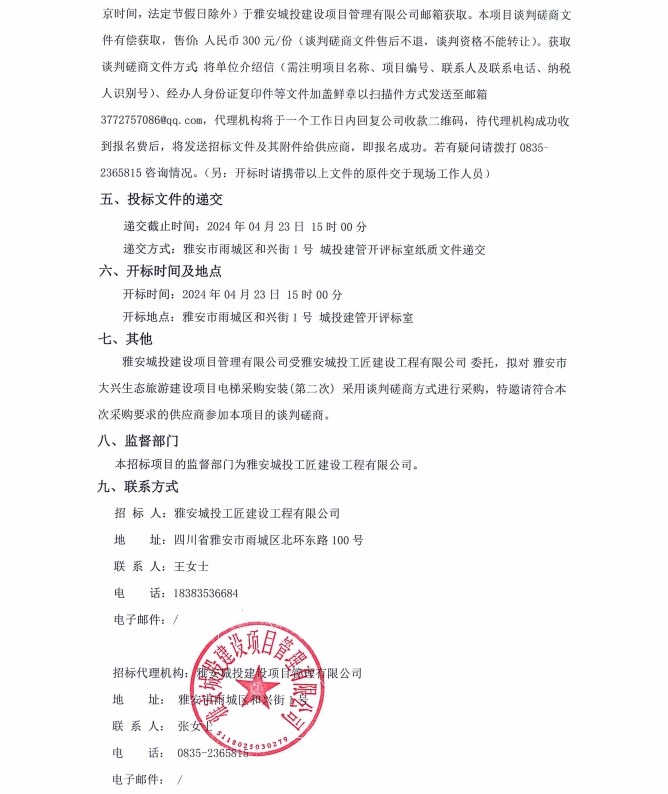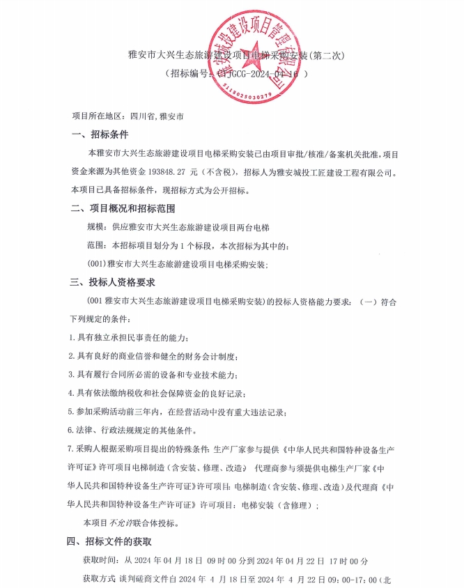 雅安市大興生態(tài)旅游建設(shè)項(xiàng)目電梯采購(gòu)安裝(第二次)公告