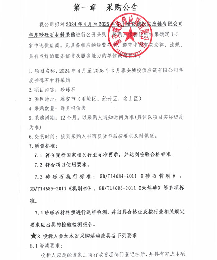 2024年4月至2025年3月雅安城投供應(yīng)鏈有限公司年度砂礫石材料采購(gòu)公告