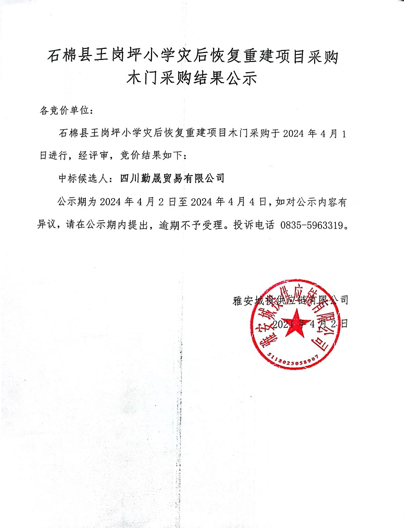 石棉縣王崗坪小學(xué)災(zāi)后恢復(fù)重建項(xiàng)目采購木門采購結(jié)果公示