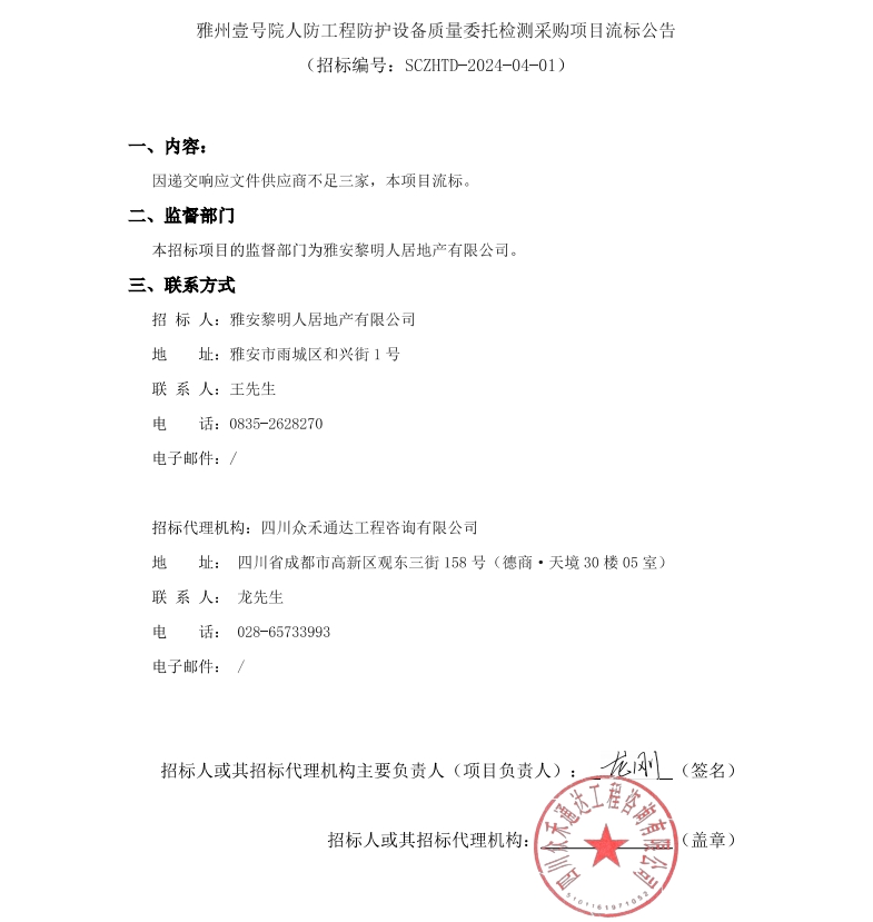 雅州壹號院人防工程防護設備質(zhì)量委托檢測采購項目流標公告