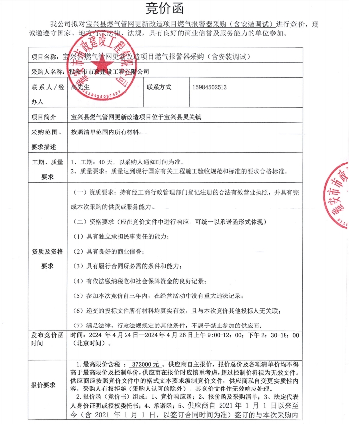 寶興縣燃?xì)夤芫W(wǎng)更新改造項(xiàng)目燃?xì)鈭?bào)警器采購(含安裝調(diào)試)競價公告