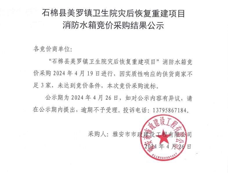 石棉縣美羅鎮(zhèn)衛(wèi)生院災(zāi)后恢復(fù)重建項(xiàng)目消防水箱材料競價(jià)采購結(jié)果公示