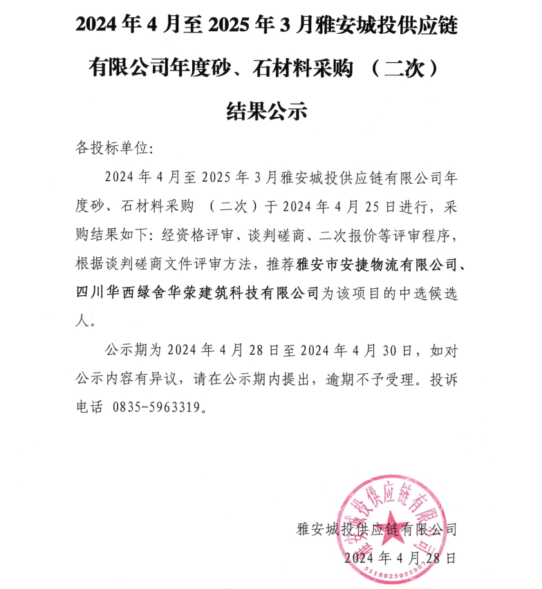 2024年4月至2025年3月雅安城投供應(yīng)鏈有限公司年度砂、石材料采購(gòu)(二次)結(jié)果公示