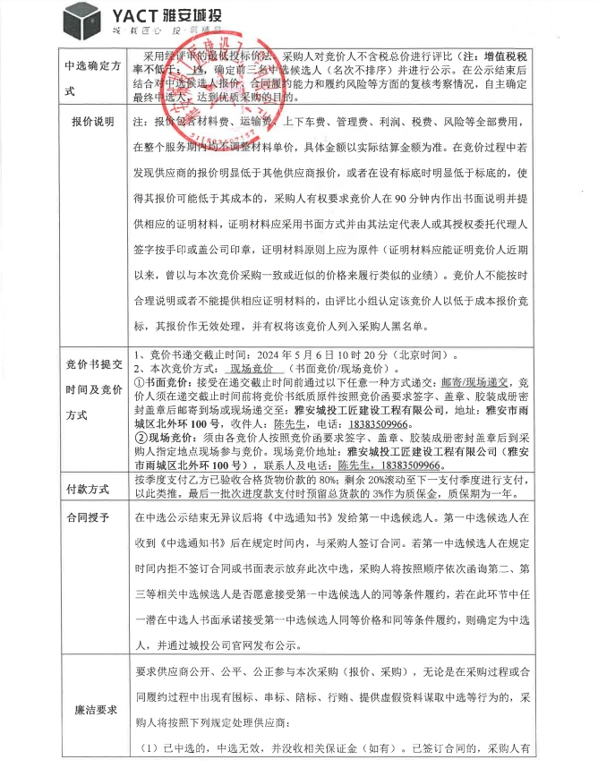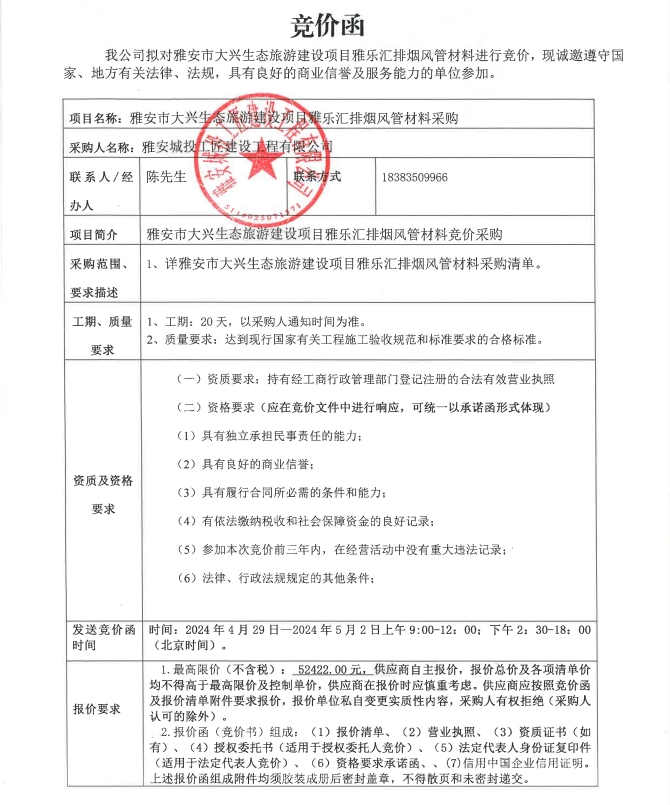 雅安市大興生態(tài)旅游建設(shè)項(xiàng)目雅樂匯排煙風(fēng)管材料采購競價(jià)公告