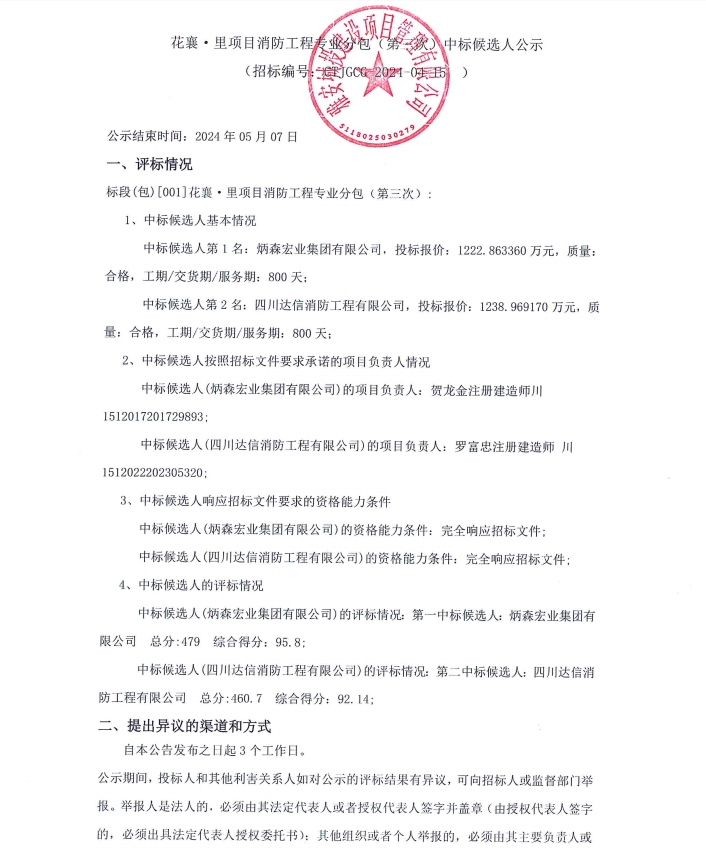 花襄·里項目消防工程專業(yè)分包(第三次)中標候選人公示