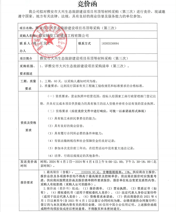 雅安市大興生態(tài)旅游建設(shè)項目吊頂?shù)炔牧喜少彛ǖ谌危└們r公告