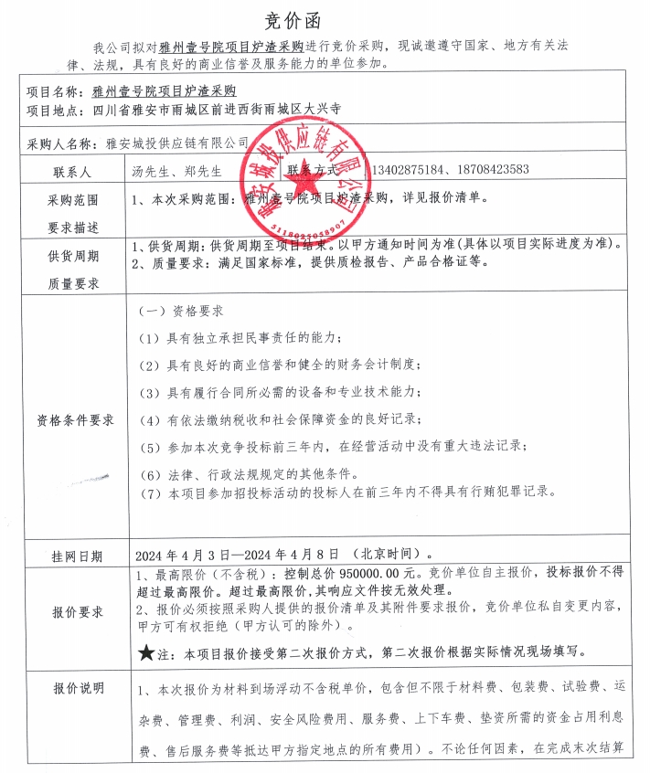 雅州壹號(hào)院項(xiàng)目爐渣采購(gòu)競(jìng)價(jià)公告
