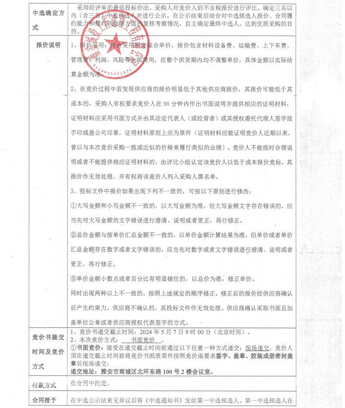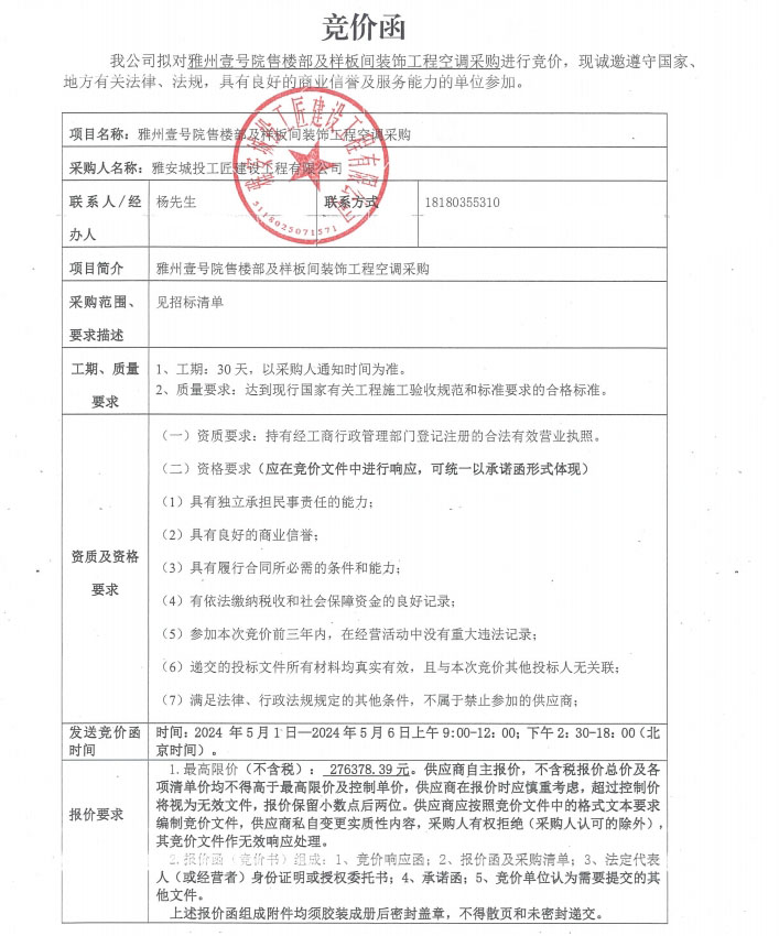 競(jìng)價(jià)函-空調(diào)采購-雅州壹號(hào)院售樓部及樣板間