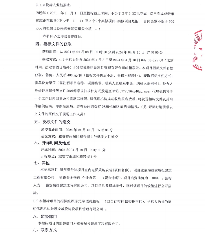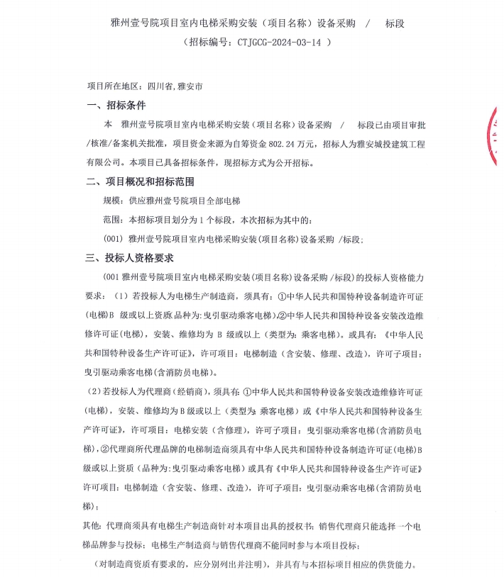雅州壹號院項目室內(nèi)電梯采購安裝(項目名稱)設備采購/標段公告