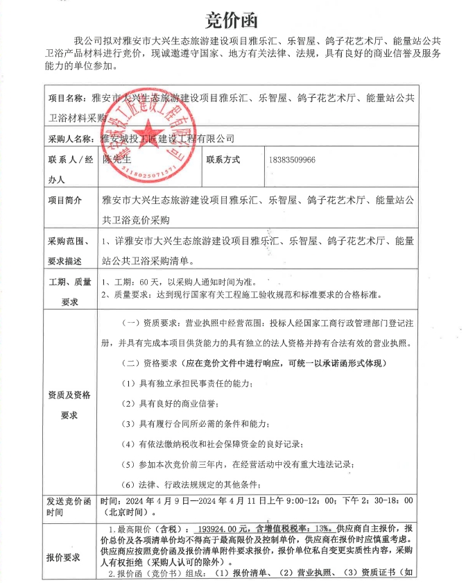 雅安市大興生態(tài)旅游建設(shè)項(xiàng)目雅樂匯、樂智屋、鴿子花藝術(shù)廳、能量站公共衛(wèi)浴材料采購(gòu)競(jìng)價(jià)公告
