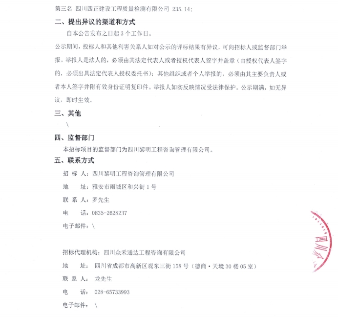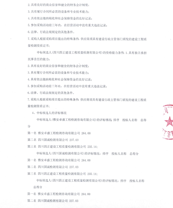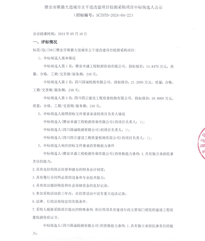 雅安市熊貓大道城市主干道改建項目檢測采購項目中標候選人公示