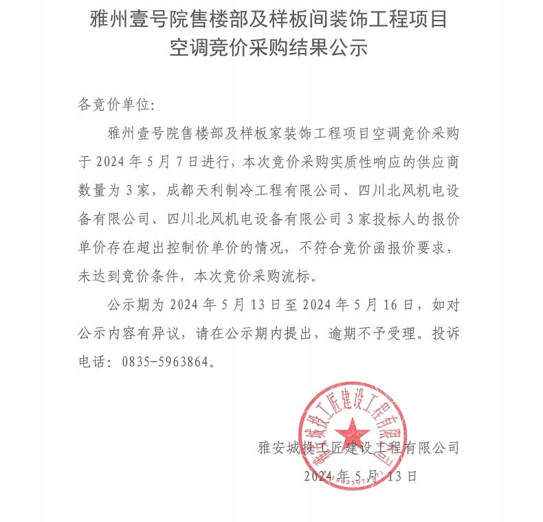 雅州壹號(hào)院售樓部及樣板間裝飾工程空調(diào)競價(jià)采購結(jié)果公示