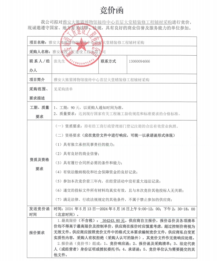 雅安大熊貓博物館接待中心首層大堂精裝修工程輔材采購競價公告