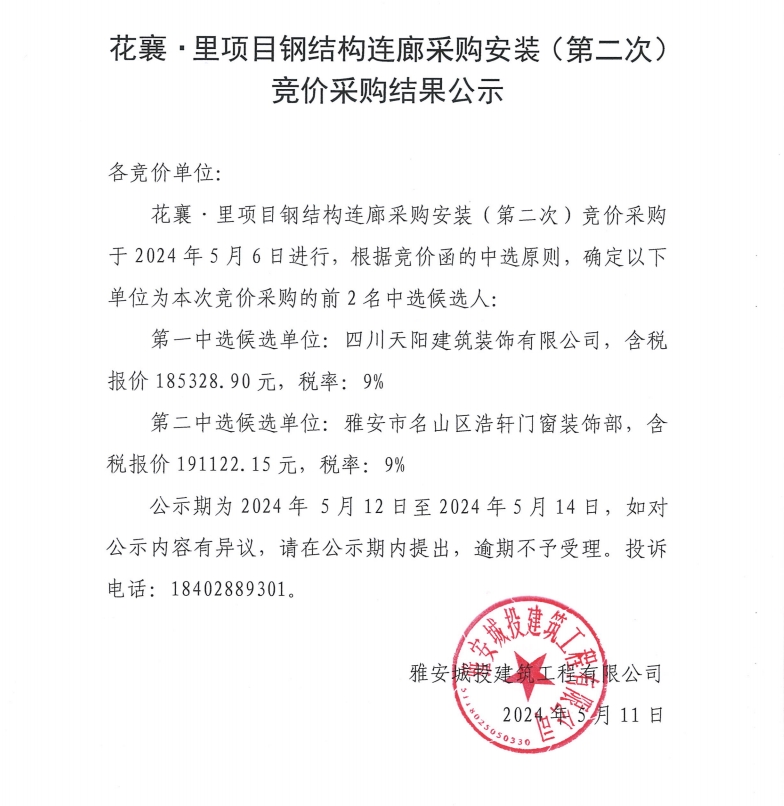 花襄·里項(xiàng)目鋼結(jié)構(gòu)連廊采購(gòu)安裝(第二次)競(jìng)價(jià)采購(gòu)結(jié)果公示