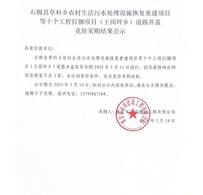 石棉縣草科鄉(xiāng)農(nóng)村生活污水處理設(shè)施恢復(fù)重建項(xiàng)目等十個工程打捆項(xiàng)目(王崗坪鄉(xiāng))道路井蓋競價(jià)采購結(jié)果公示