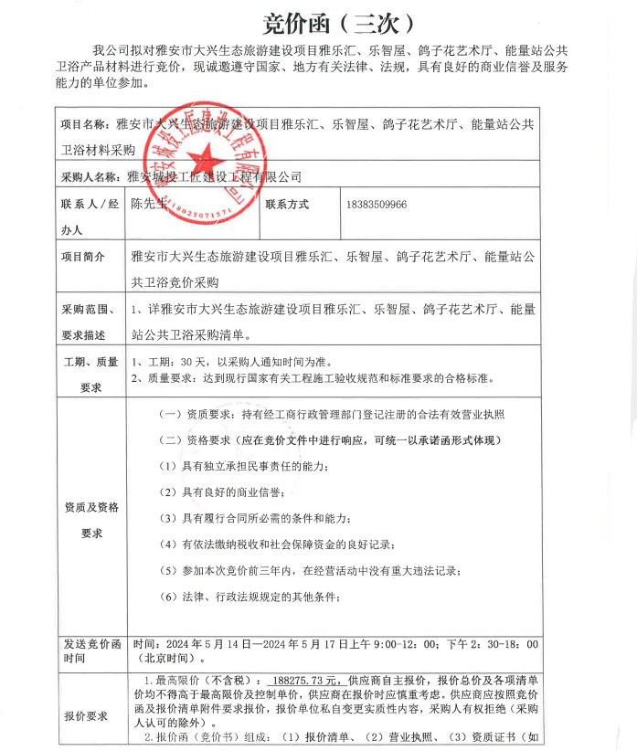 雅安市大興生態(tài)旅游建設(shè)項(xiàng)目雅樂(lè)匯、樂(lè)智屋、鴿子花藝術(shù)廳、能量站公共衛(wèi)浴材料采購(gòu)(三次)競(jìng)價(jià)公告