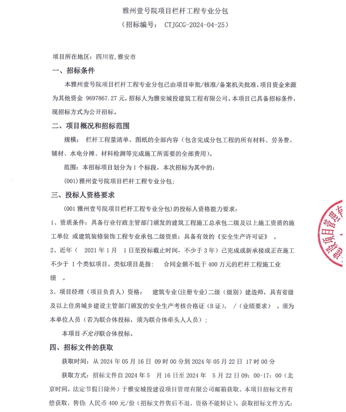 雅州壹號(hào)院項(xiàng)目欄桿工程專業(yè)分包采購(gòu)公告