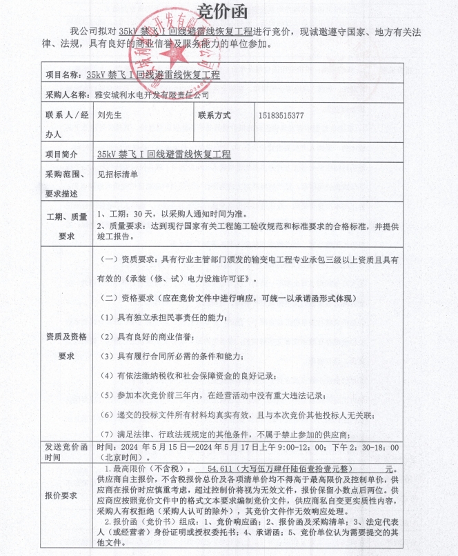 35kV禁飛I回線避雷線恢復工程競價公告