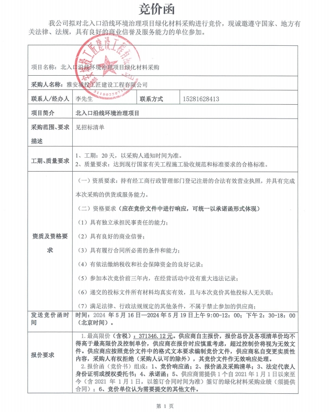 北入口沿線環(huán)境治理項目綠化材料采購競價公告