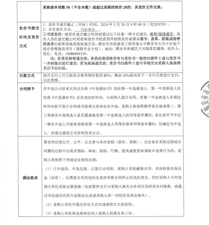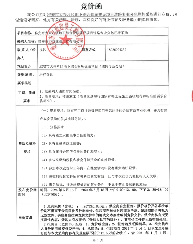 雅安市大興片區(qū)地下綜合管廊建設(shè)項(xiàng)目道路專業(yè)分包欄桿采購競(jìng)價(jià)公告