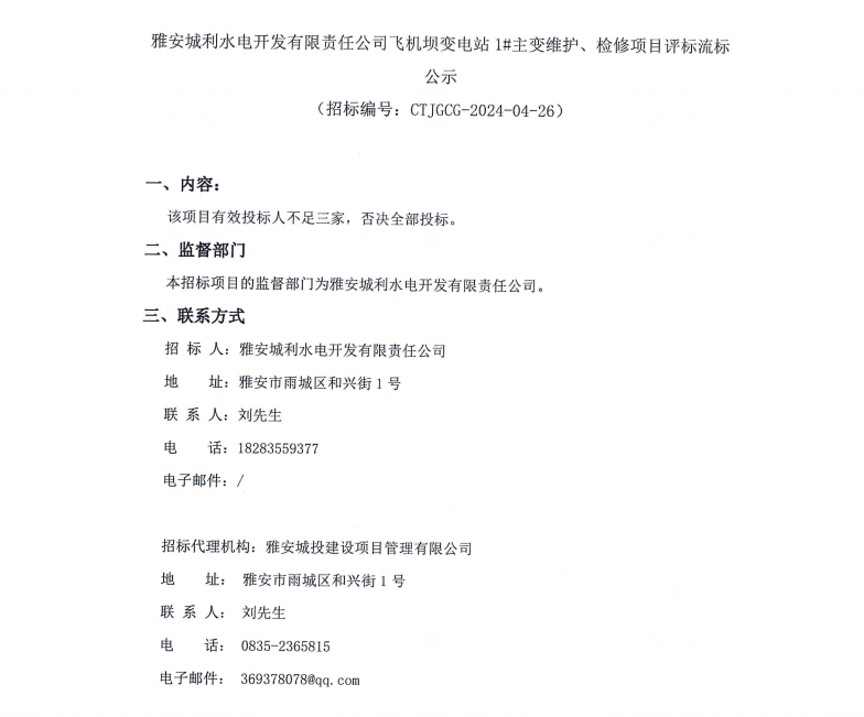 雅安城利水電開發(fā)有限責(zé)任公司飛機壩變電站1#主變維護、檢修項目評標流標公示