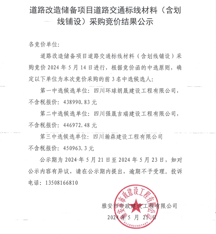 道路改造儲備項目道路交通標線材料(含劃線鋪設(shè))采購競價結(jié)果公示