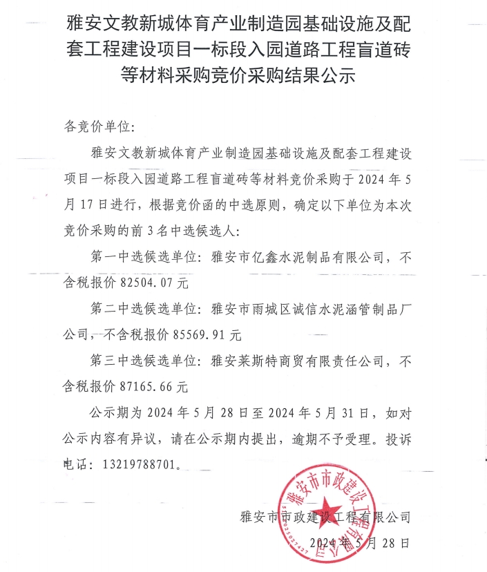雅安文教新城體育產(chǎn)業(yè)制造園基礎(chǔ)設(shè)施及配套工程建設(shè)項(xiàng)目一標(biāo)段入園道路工程盲道磚等材料采購(gòu)競(jìng)價(jià)采購(gòu)結(jié)果公示