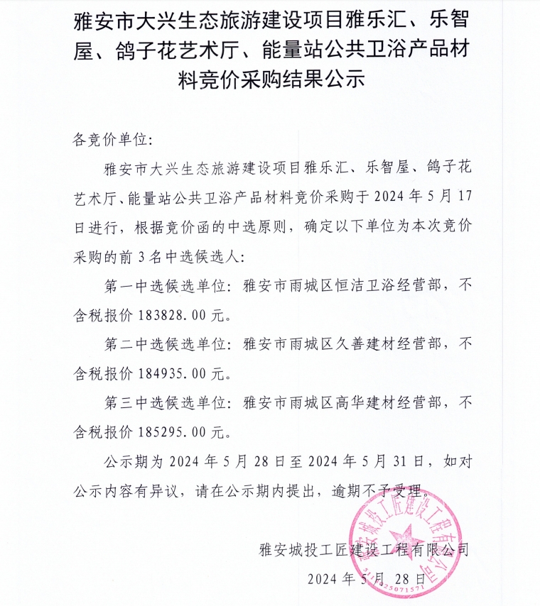 雅安市大興生態(tài)旅游建設(shè)項(xiàng)目雅樂匯、樂智屋、鴿子花藝術(shù)廳、能量站公共衛(wèi)浴材料競(jìng)價(jià)采購(gòu)結(jié)果公示