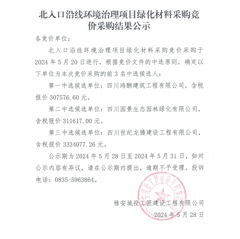 北入口沿線環(huán)境治理項(xiàng)目綠化材料采購(gòu)競(jìng)價(jià)采購(gòu)結(jié)果公示