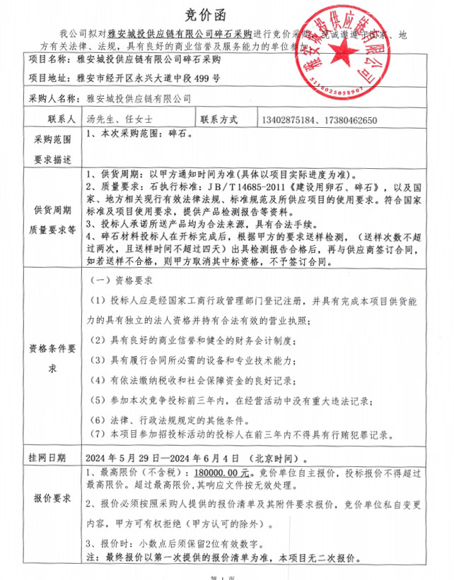 雅安城投供應(yīng)鏈有限公司碎石采購競價(jià)公告