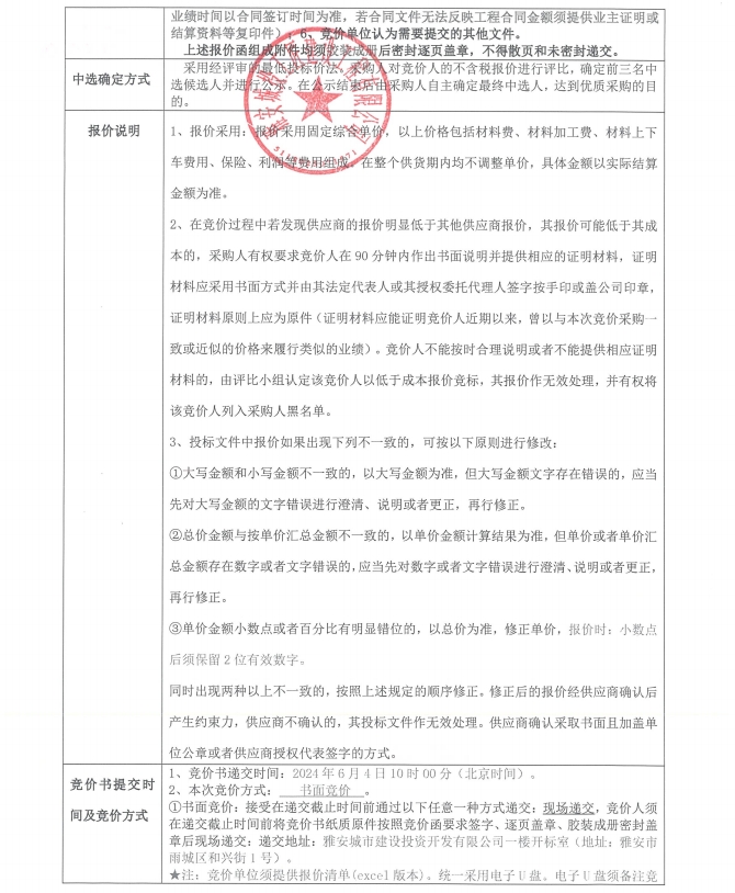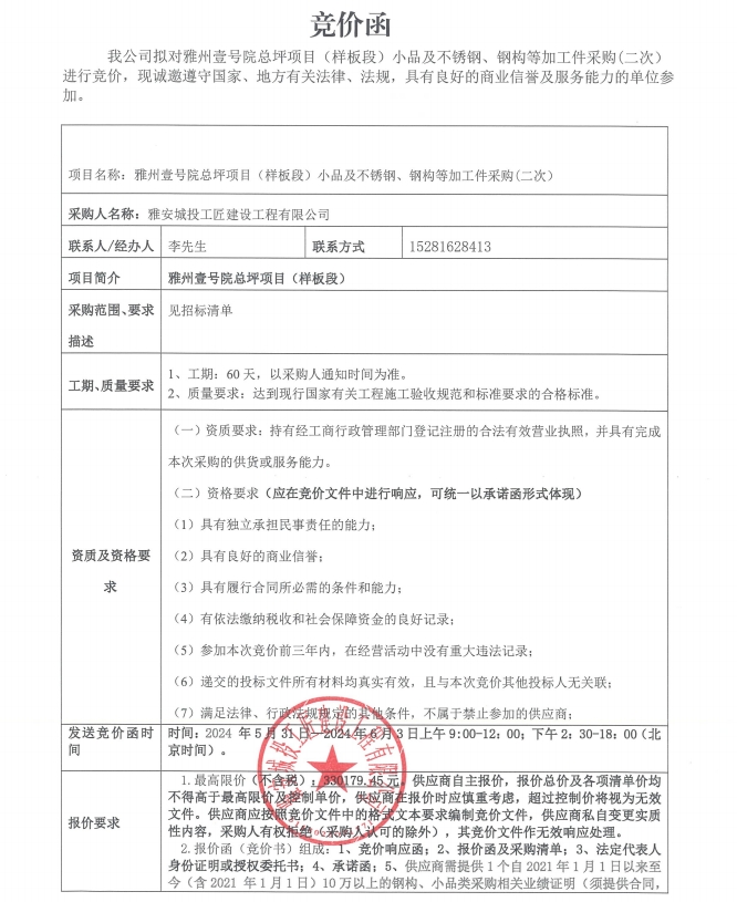 雅州壹號院總坪項(xiàng)目(樣板段)小品及不銹鋼、鋼構(gòu)等加工件的采購競價(jià)函