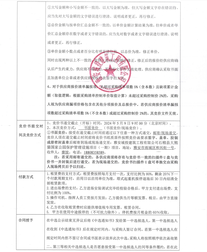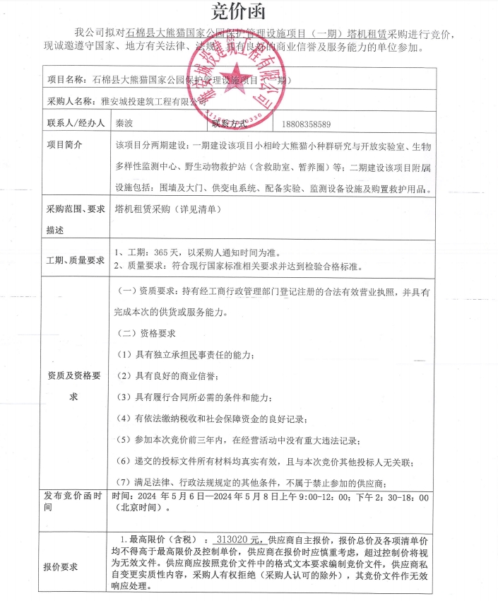 石棉縣大熊貓國家公園保護(hù)管理設(shè)施項目(一期)塔機租賃采購競價公告