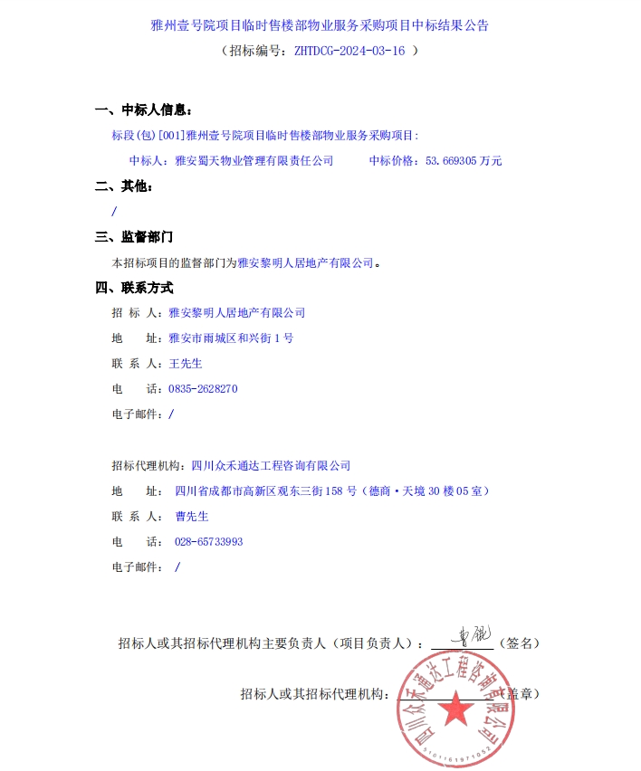 雅州壹號院項目臨時售樓部物業(yè)服務(wù)采購項目中標(biāo)結(jié)果公告