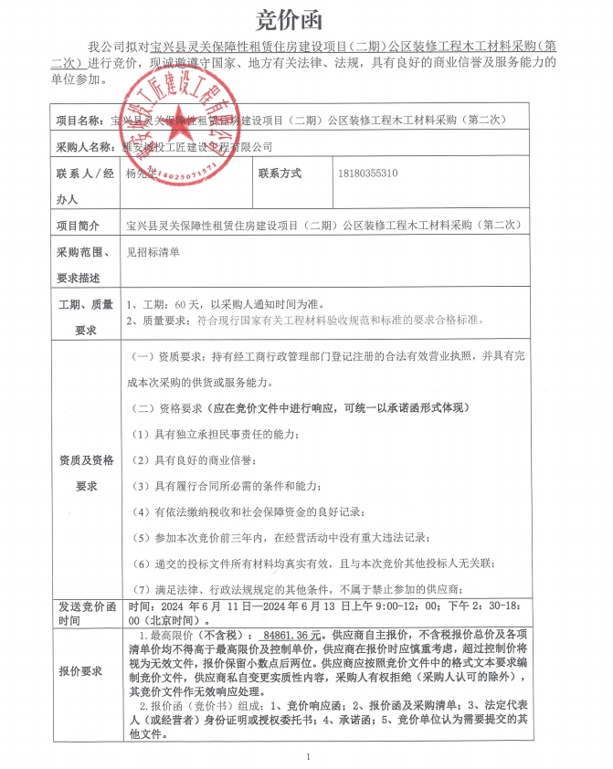 寶興縣靈關保障性租賃住房建設項目(二期)公區(qū)裝修工程木工材料采購(第二次)競價公告