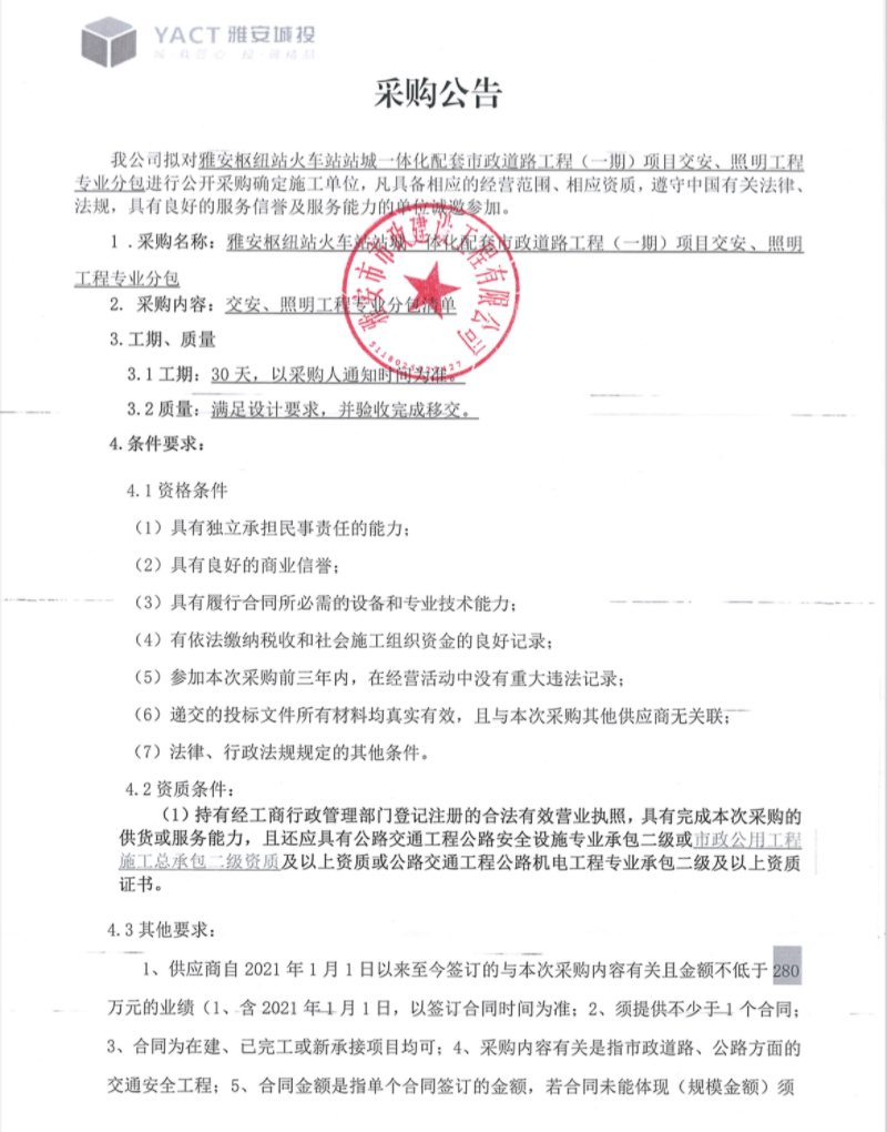 雅安樞紐站火車站站城一體化配套市政道路工程(一期)項(xiàng)目交安、照明工程專業(yè)分包采購(gòu)公告