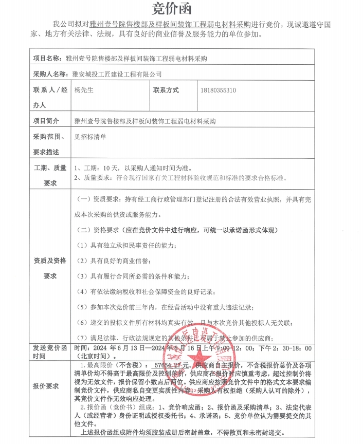 雅州壹號院售樓部及樣板間裝飾工程弱電材料采購競價(jià)公告