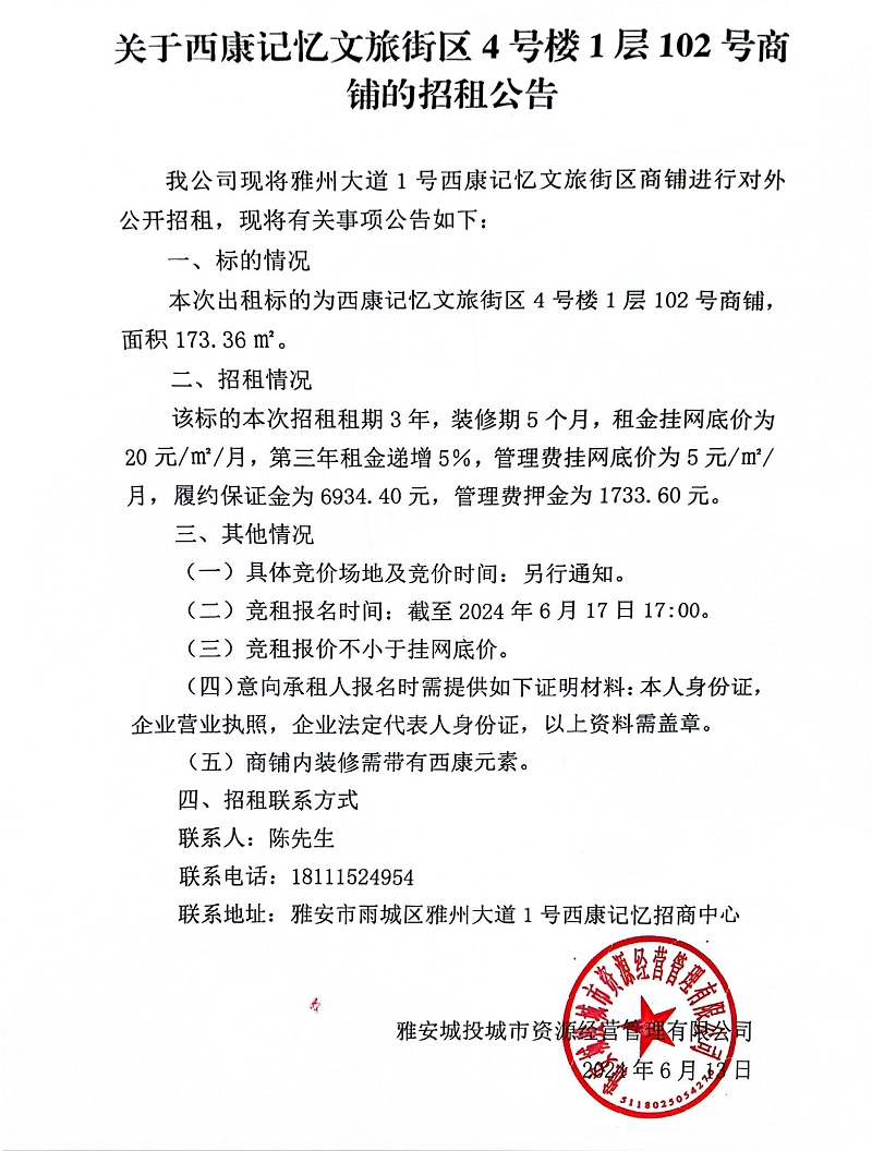 關(guān)于西康記憶文旅街區(qū)4號(hào)樓1層102商鋪的招租公告
