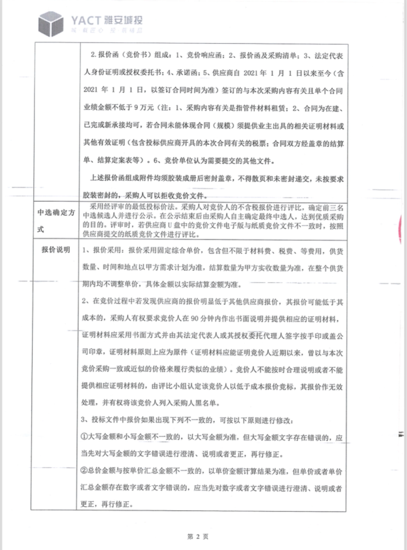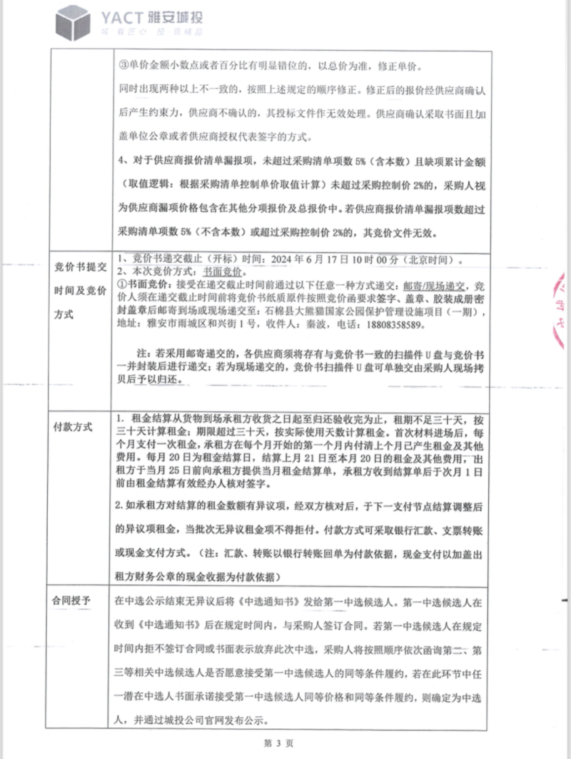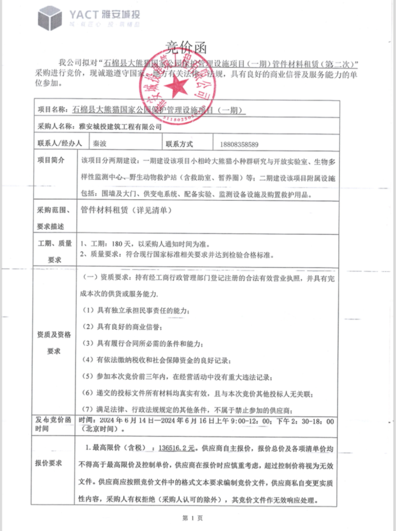 石棉縣大熊貓國家公園保護管理設施項目(一期)管件材料租賃(第二次)競價公告